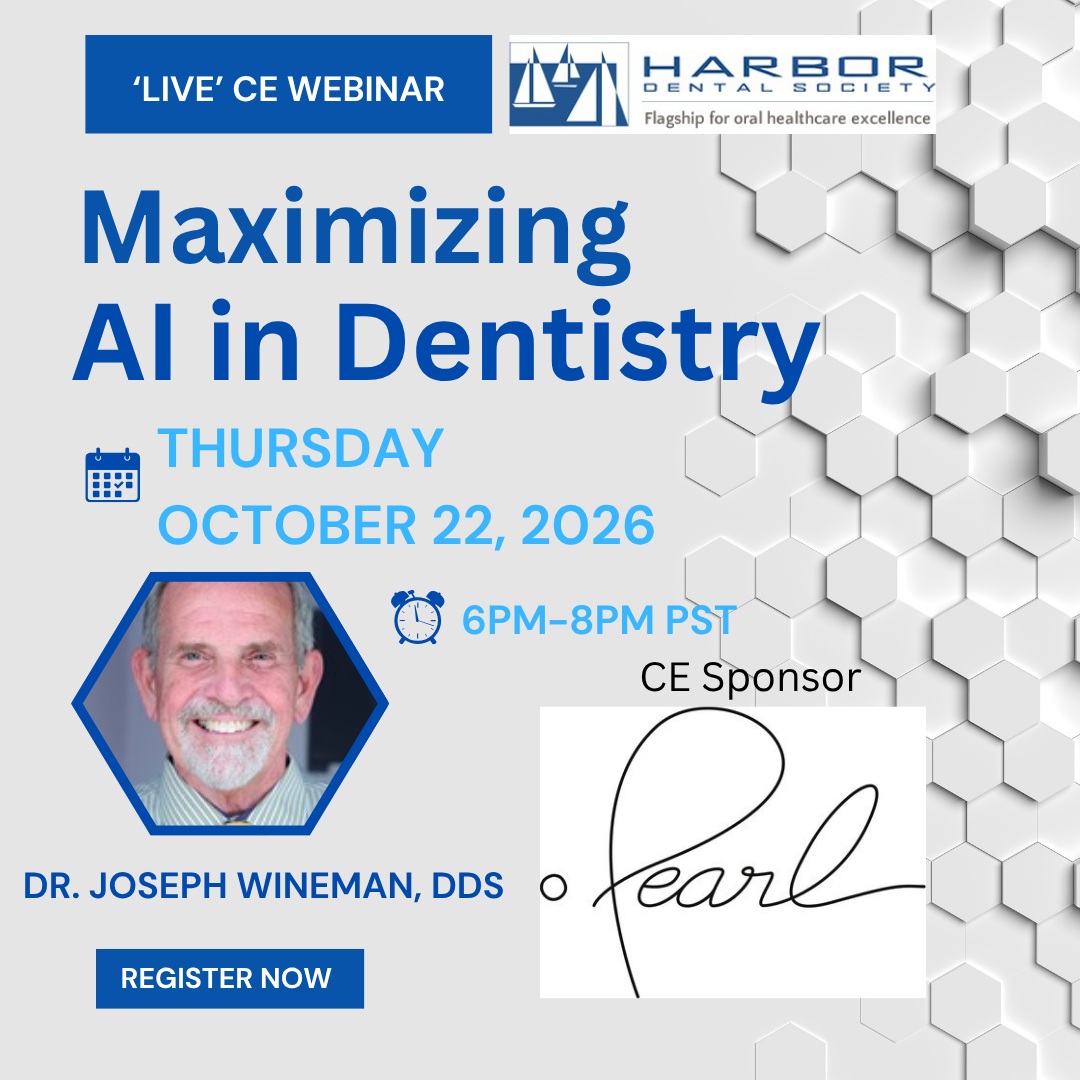 'live' CE Webinar: Maximizing AI in Dentistry Thursday, October 22, 2026 6pm-8pm PST 2 CEU core Sponsor: Pearl