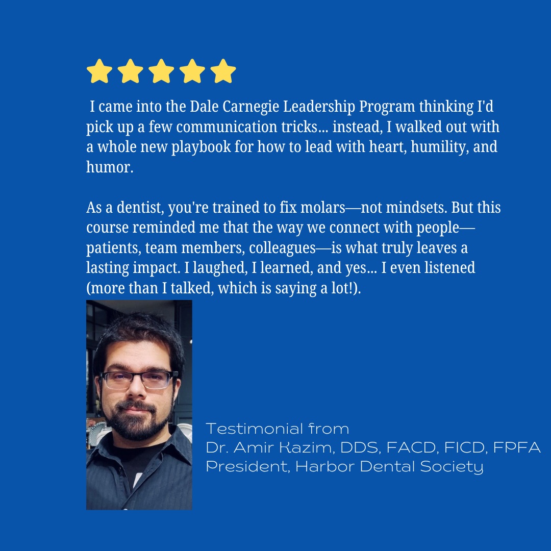 The ADA Leadership Academy, powered by Dale Carnegie is an exciting new member benefit Harbor Dental Society is proud to offer to Harbor members only. This exciting initiative aims to help you enhance your leadership, communications, dental team management skills—qualities that are increasingly vital in today’s technology-driven landscape, where personal and professional connections are essential for achieving success.