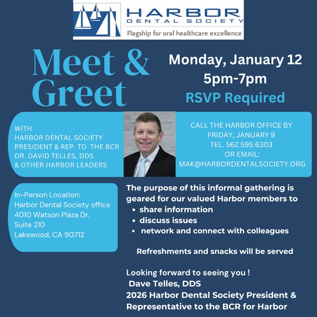 RSVP Required - Fill out this online form (this is a complimentary event) or email: Mak@Harbordentalsociety.org or call the Harbor office 562.595.6303 by January 9th as spots are limited.