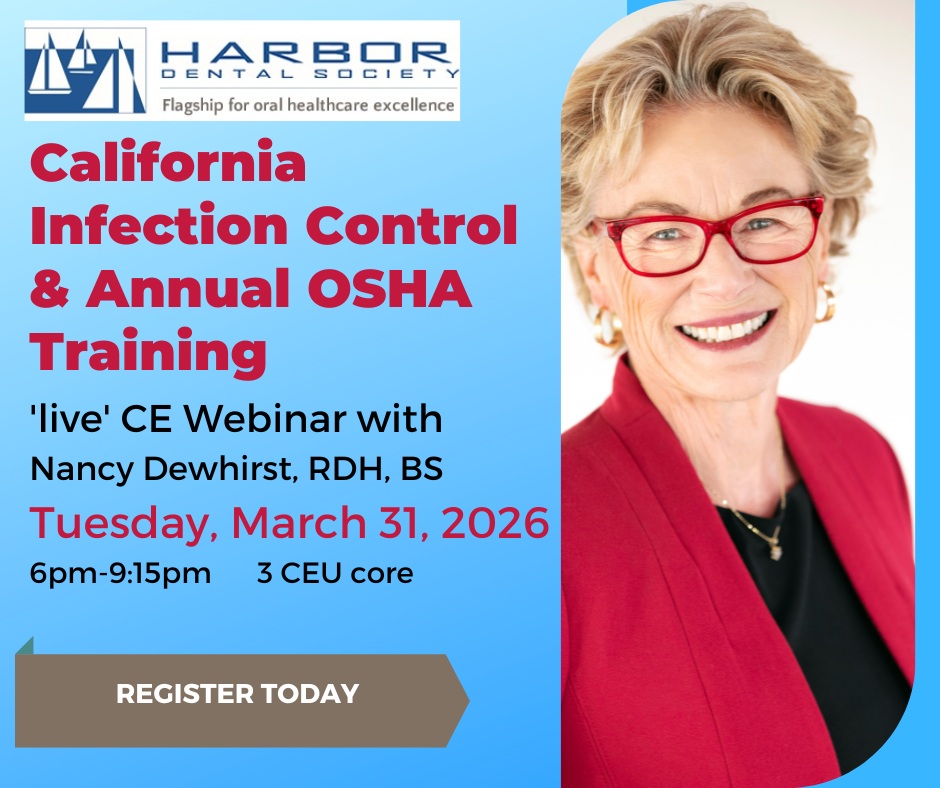 Bio: Nancy Dewhirst, RDH, BS graduated from the University of Southern California, practiced dental hygiene for 20 years, is adjunct dental hygiene faculty at West Coast University, and is a member of Sigma Phi Alpha. Ms. Dewhirst is consistently listed as one of the nation’s “Leaders in CE”, presents over 100 seminars a year, is featured at major U.S. and Canadian Dental Conferences, and is a member of the California Dental Association Speakers Bureau. She is an AAMI/ANSI/ADA Standards Committee member, Editor-in-Chief of OSAP (ADS)’s Infection Control In Practice, recipient of ADS Chairman of the Board Special Citation for Advancing Dental Safety, has had many articles published in dental peer-reviewed journals, and has contributed to dental textbooks and guidance documents.