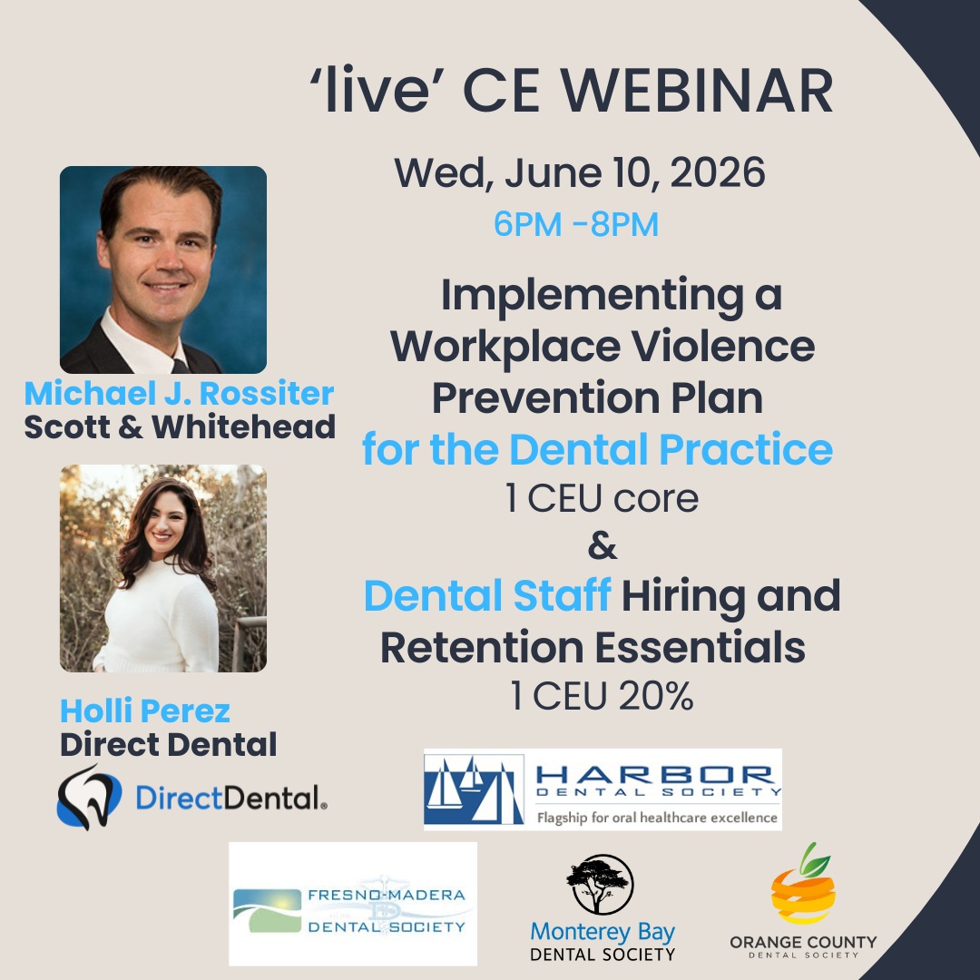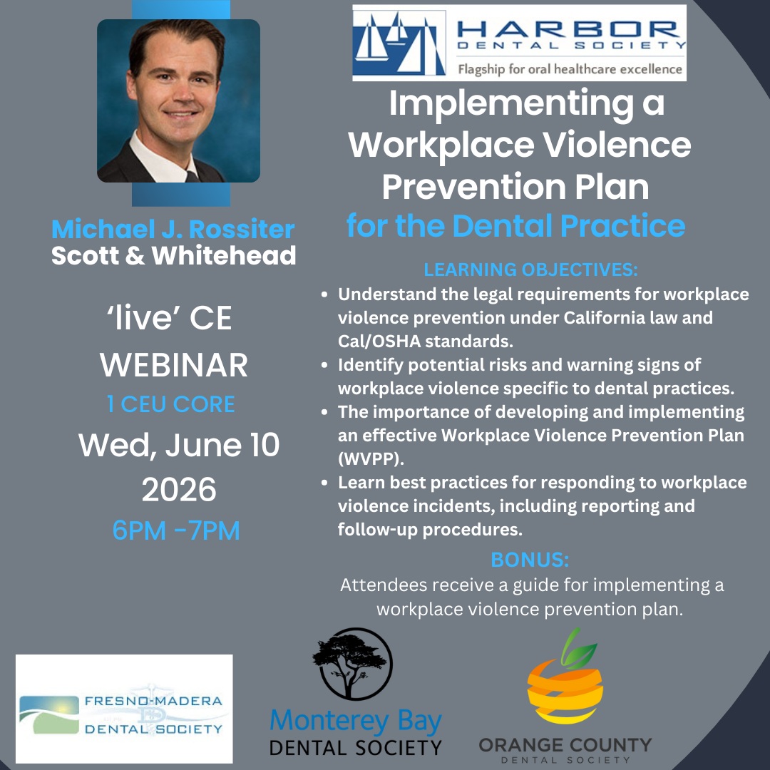 This course equips dental professionals with a clear understanding of the fundamental requirements of California’s new Workplace Violence Prevention law. Participants will learn what is required to create and implement a comprehensive Workplace Violence Prevention Plan (WVPP) tailored to the unique challenges of dental practices.