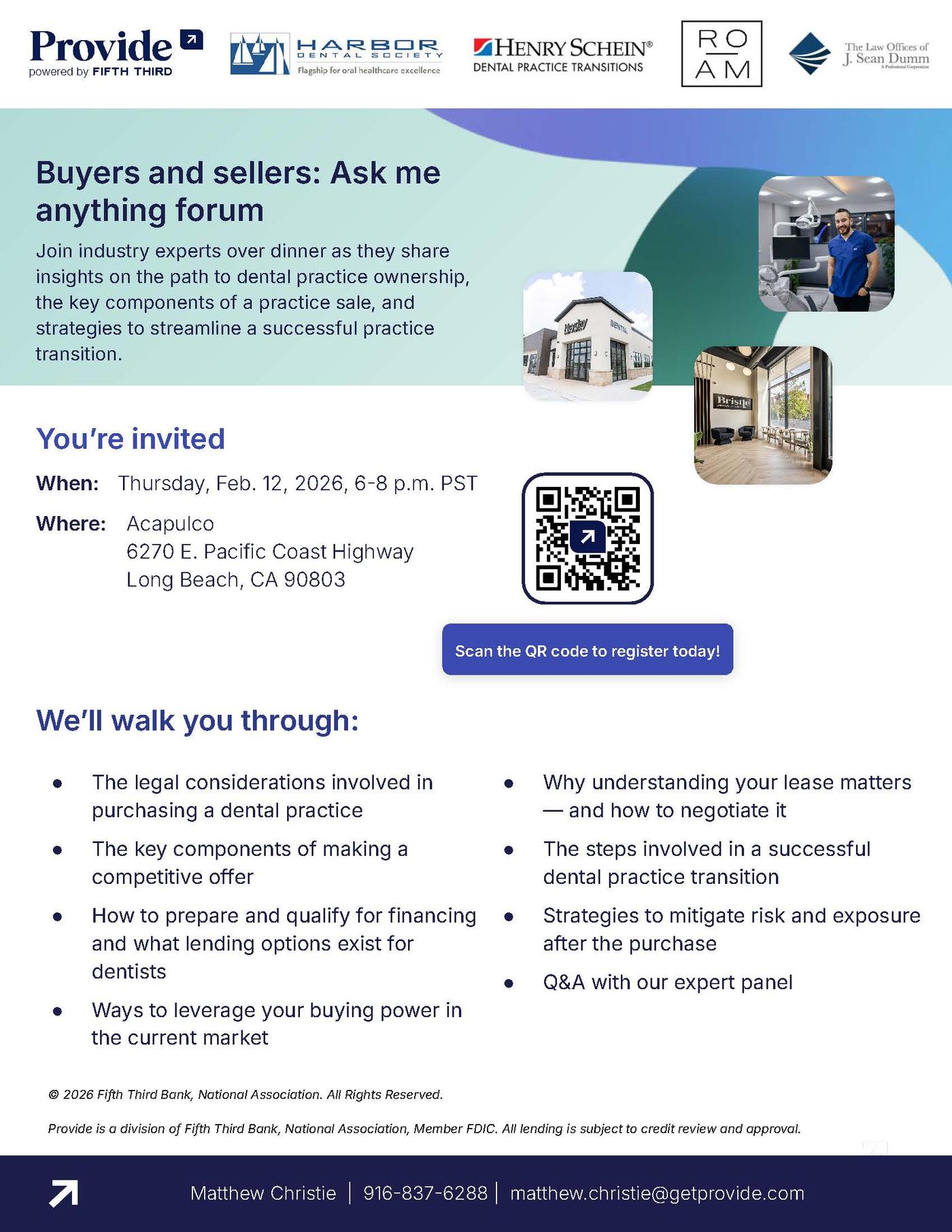 Join industry experts over dinner as they share insights on the path to dental practice ownership, the key components of a practice sale, and strategies to streamline a successful practice transition.