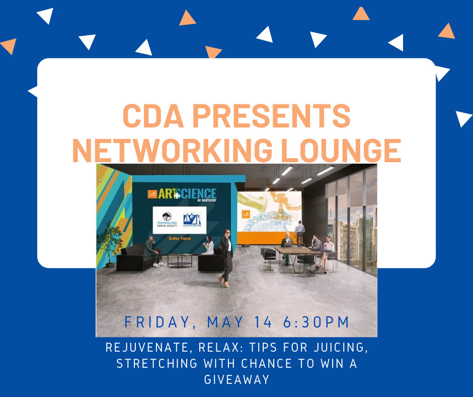 Register for CDA Presents and you will be able to attend Harbor Dental Society's first virtual Networking Lounge May 14, 6:30pm-7:30pm (virtual doors open at 6pm) co-hosted with Monterey Bay Dental Society.